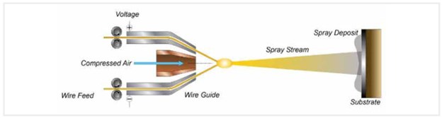 Quá trình phun hồ quang dây đôi sử dụng nguồn DC để cấp điện cho hai dây dẫn: một dây dương và một dây âm. Hai dây được tích điện với cực tính ngược nhau và được đưa vào súng hồ quang với tốc độ phù hợp và được kiểm soát. Khi chúng ta đưa các dây lại với nhau tại điểm tiếp xúc, các điện tích trái dấu trên dây sẽ tạo ra nhiệt lượng đủ để làm nóng chảy liên tục các đầu dây. Chúng tôi sử dụng khí nén để nguyên tử hóa vật liệu đang nóng chảy và đẩy nhanh nó lên bề mặt phôi để tạo thành lớp phủ.