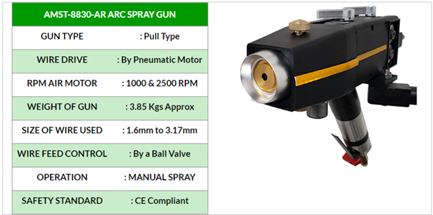 Súng phun hồ quang kiểu AMST-8830 sử dụng dòng điện một chiều để làm nóng chảy dây kim loại ở điện áp hồ quang phù hợp cần thiết cho đặc tính kim loại tương ứng và sử dụng khí nén tốc độ cao để cuối cùng phun các hạt kim loại nóng chảy thành dạng phun cực mịn lên bề mặt để được kim loại hóa. Trong quá trình phun kim loại hồ quang, hồ quang điện được tạo ra và duy trì ổn định tại điểm tiếp xúc của hai dây kim loại.